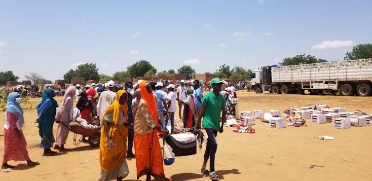 En six semaines de conflit, en date du 19 juin 2023, le Haut-Commissariat des Nations unies pour les Réfugiés (HCR) avait dénombré 115 980 personnes déplacées, majoritairement des femmes et des enfants. À cette date, le nombre de réfugiés estimés par l’organisation dépassait les 150 000. La porosité de la frontière complique la tâche des différents acteurs de l’humanitaire, confrontés aux difficultés liées à la saison des pluies, qui risquent d’épuiser les moyens de subsistance des populations.